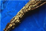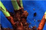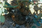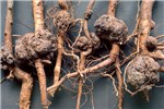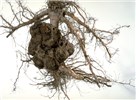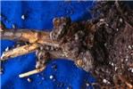 Galls also occur on lateral roots and above ground on stems, canes and vines. On some woody species, such as cottonwood and willow, galls are common on stems above ground. Types of plants affected include shrubs, ornamental flowering trees, fruit trees (temperate to tropical), tubers, vines, tobacco, annuals, gymnosperms, etc. In temperate zones, symptoms appear with the onset of warm temperatures in May or June and can increase rapidly in size and number. Galls first appear as small, callus-like outgrowths within 2-4 weeks of infection when temperatures are at or above 20°C. At first the galls cannot be distinguished from wound callus, but galls usually develop more rapidly than callus, producing white to tan-coloured, more-or-less spherical galls. Gall texture varies from soft and spongy in the early period of formation to hard as they age, depending largely upon the content of disorganized vascular elements. Gall surfaces typically are not covered by an epidermis and can vary in colour. Below-ground galls are initially whitish, changing to tan-brown and becoming necrotic with age; aerial galls on herbaceous plants can be green, depending upon chloroplast content. Aerial galls on caneberries often become necrotic, black and dry during the winter in temperate zones. In the spring, new galls develop adjacent to the old tumour site. Above-ground galls on grapevines, blueberry stems and brambles are usually elongate, erumpent ridges of tissue bursting through the outer stem tissues. Erumpent gall tissue may cause the stems to split and lose moisture, resulting in small, low quality fruit. Galled plants may be stunted and exhibit poorly developed root systems, thus making them more susceptible to adverse environmental conditions such as winter injury and blow-over caused by heavy winds.
