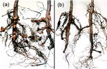 Infected plants usually develop galls (tumour-like swellings) on roots and stems below ground or at the crown of the plant, hence the name crown gall. A condition known as hairy root (excessive proliferation of roots) is frequently a companion with crown gall on plants such as apple; the symptom is often referred to as non-infectious hairy root because of the difficulty of isolating pathogenic Rhizobium from hairy root tissues. Furthermore, when apple trees exhibiting hairy root at planting time were grown for 4-5 years in the field and lifted to examine root development, the root systems were normal in appearance.